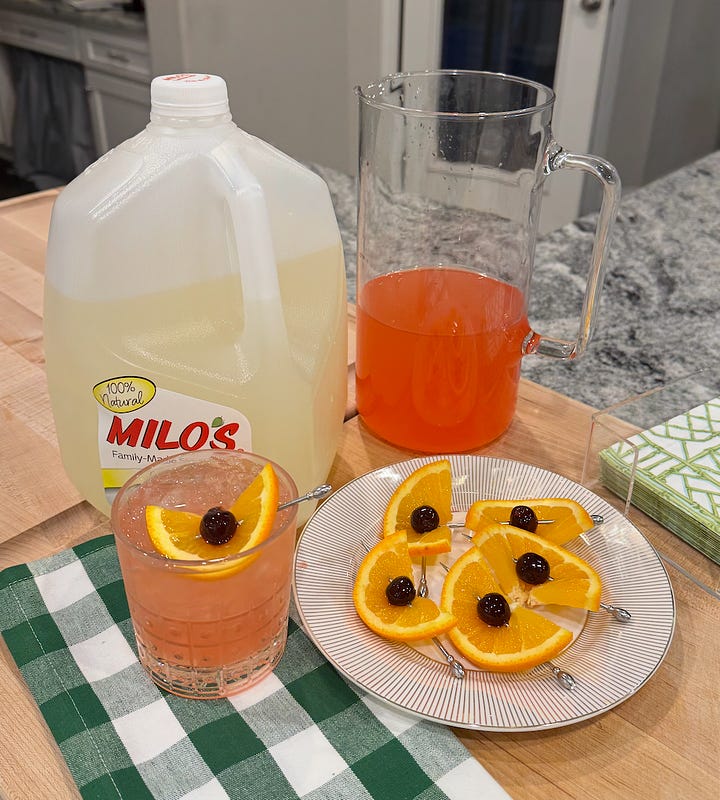 We’re kicking things off in the correct order- cocktails first. The Azalea is a refreshing, easy breezy, drinkable cocktail with just 3 ingredients: lemonade, vodka, and grenadine. If I played golf, I can definitely see myself tossing back a few of these on a warm spring day on the course, but they taste just as good while you’re halfway listening to the Masters on TV before gently nodding off to sleep on the couch. For my version, I’m reaching for my standby- Milo’s Lemonade. It’s made with simple ingredients and has that true, fresh lemon taste that makes it an ideal mix-in for cocktails like this. I make mine in a big batch to make serving a crowd that much easier. You can pre-batch the cocktails and assemble the garnishes ahead of time, so that your guests can be immediately greeted with a drink upon arrival. Thanks to Milo’s for sponsoring this portion of today’s newsletter! You can find Milo’s products at a store near you HERE.