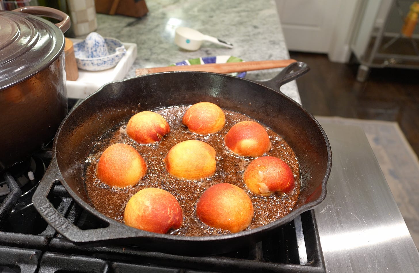 Cut each peach in half and remove the pits. Next, preheat a cast iron skillet over low heat. Add the butter and brown sugar, and allow them to melt. Stir to combine, and allow the mixture to heat up and begin to bubble- about 3 minutes. Add the salt and cinnamon if using. Place the peach halves in the caramel sauce, cut side down, and allow them to cook and soften over low heat for 7-10 minutes, being careful to not let the sugar burn. Serve warm with vanilla ice cream and a drizzle of the pan sauce on top.